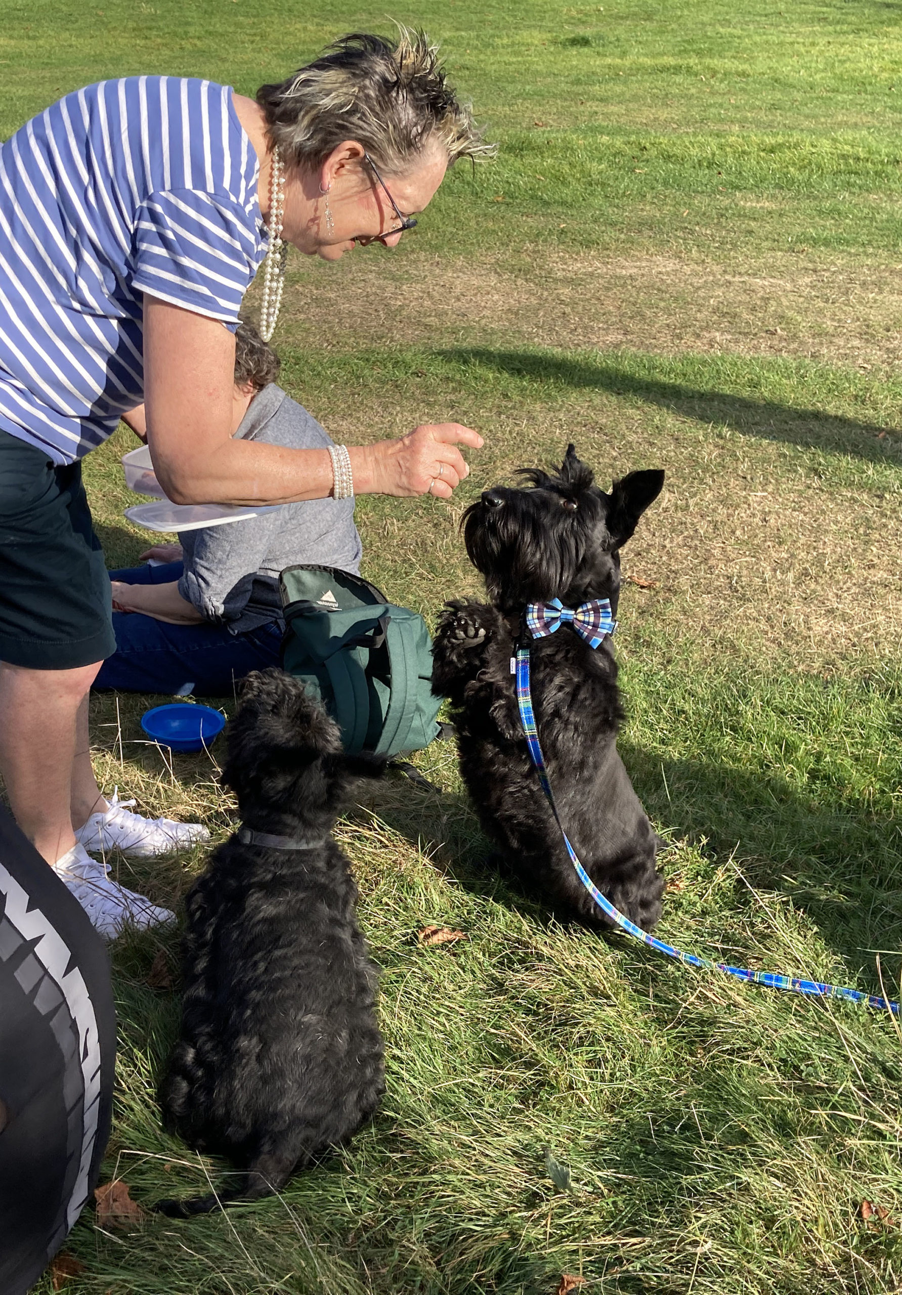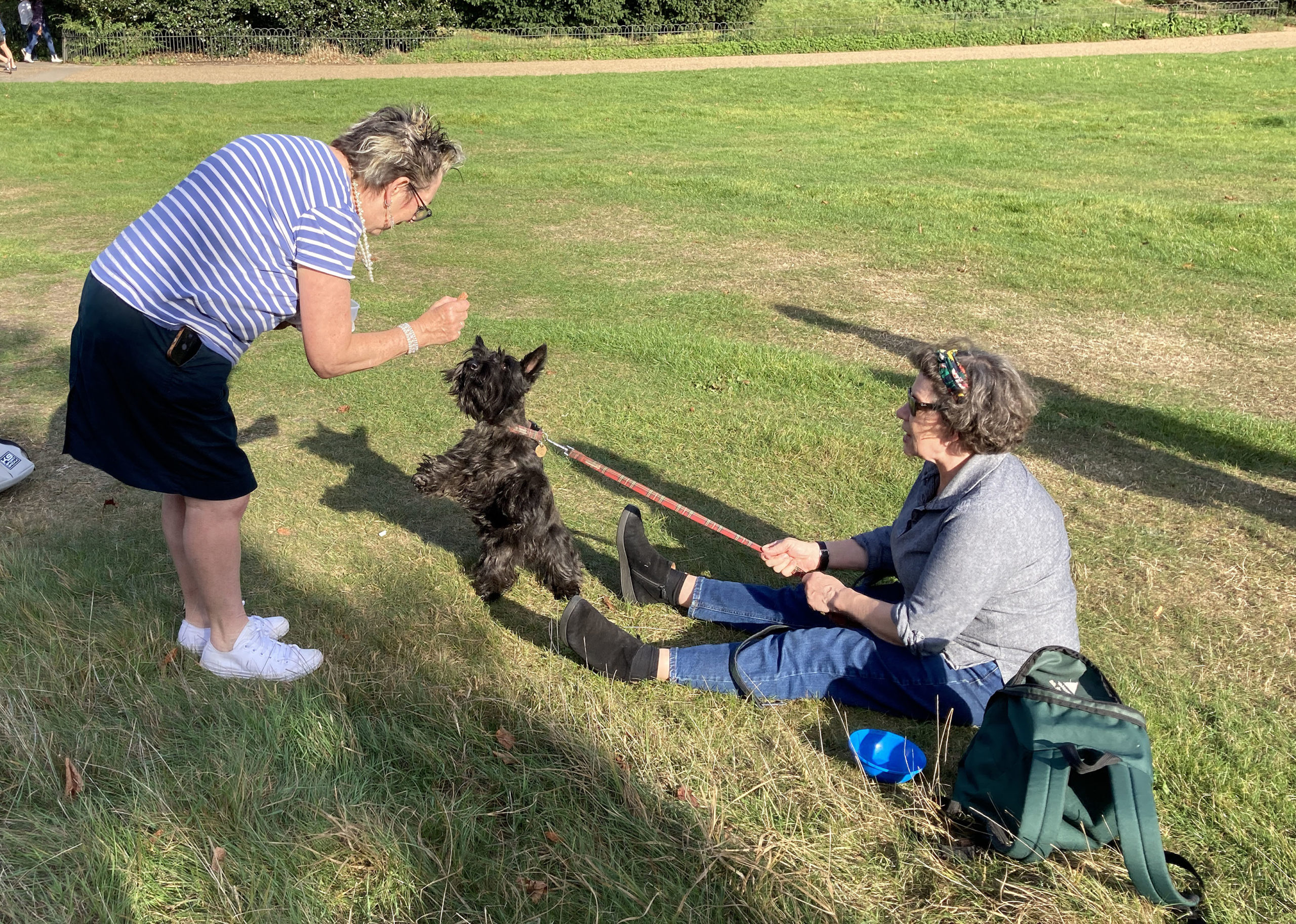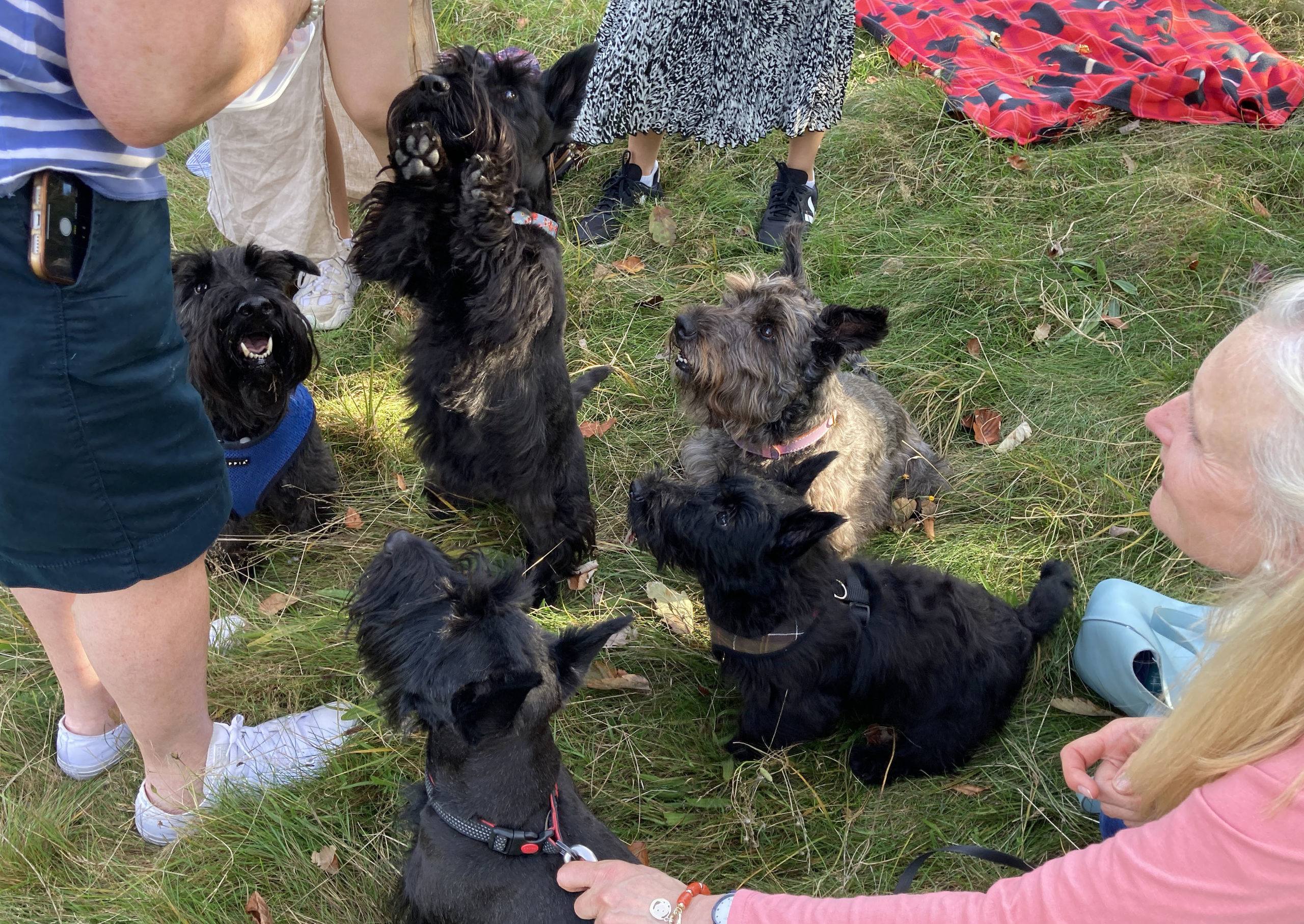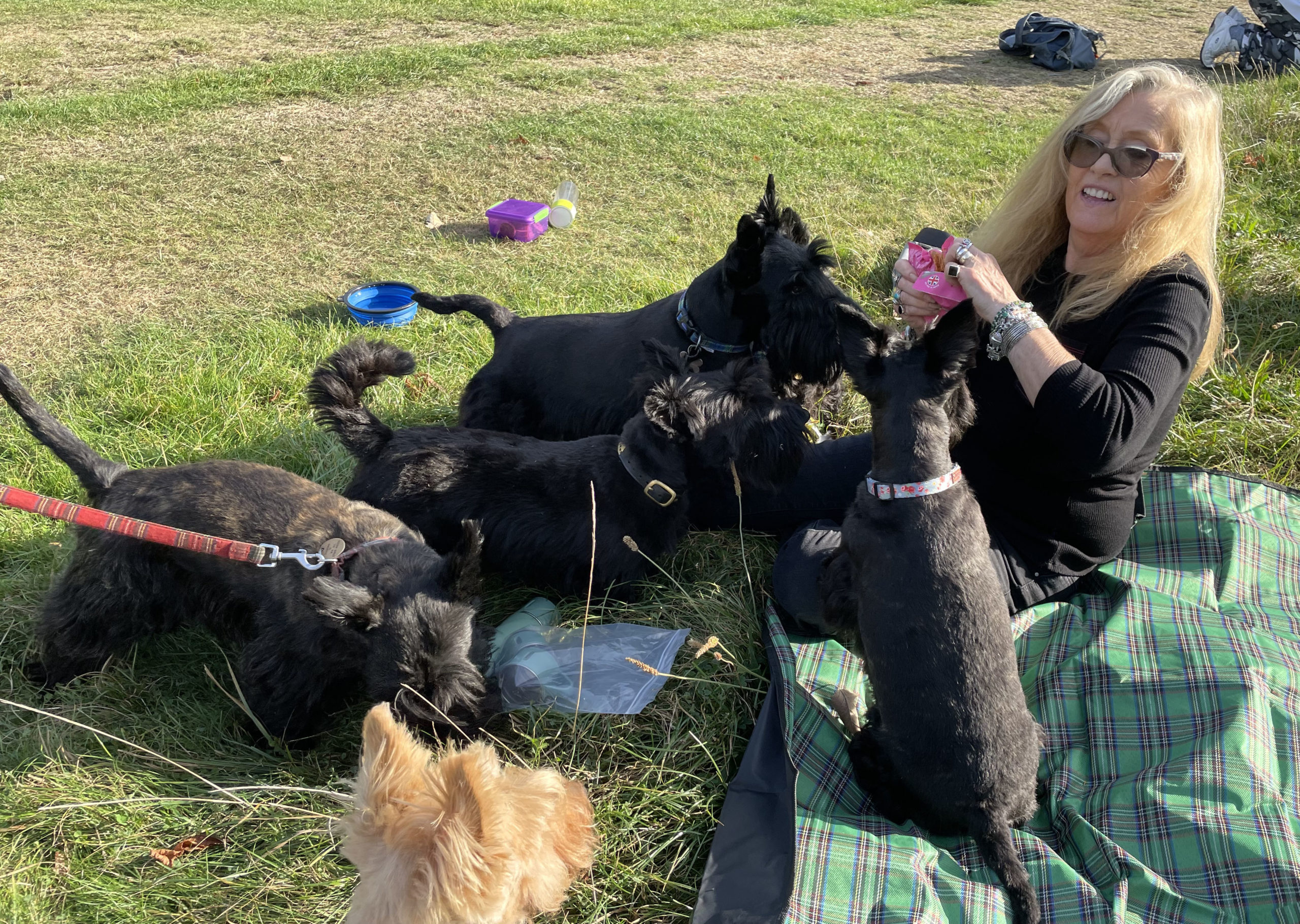 Once we were seated, the treats emerged. Glyn, opening a bag, was immediately submerged by five keen Scotties, tongues out, mouths thrust hopefully forward. Karen’s handbag was pillaged repeatedly by Archie and Bobby.